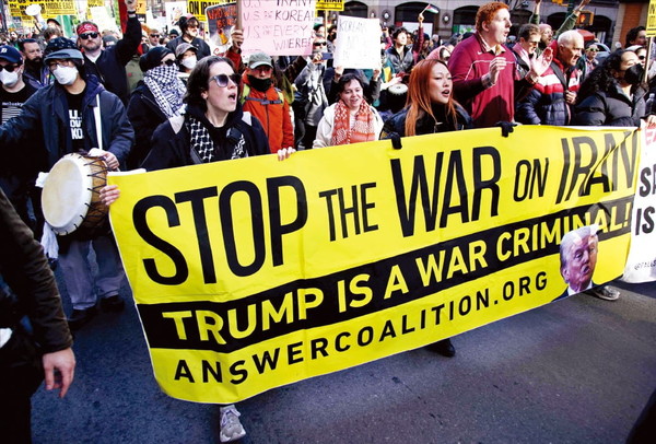 지난달 28일 미국 뉴욕 타임스스퀘어에서 시위대가 ‘이란과의 전쟁을 중단하라’고 적힌 현수막을 들고 행...