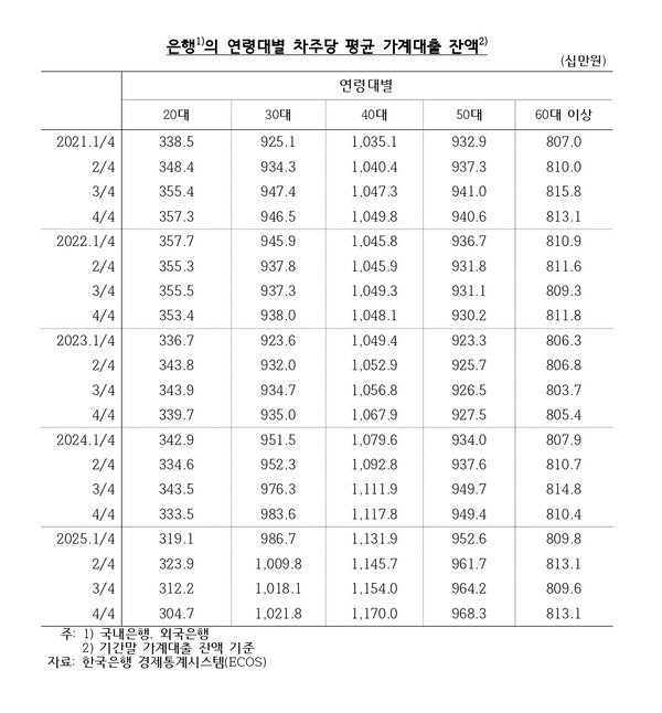 지난해 우리나라 대부분 연령대에서 대출잔액이 늘면서 은행 가계대출 전체 차주의 1인당 대출잔액도 9152만원으로 역대 최대치를 기록했다. 이는 2024년 말(8871만원)보다 281만원 증가한 수준이다.