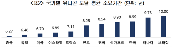 기업의 설립부터 유니콘 기업으로 성장하기까지 소요된 기간을 분석한 결과, 한국 유니콘 기업들은 평균 8.99년으로 최하위권을 기록했다.