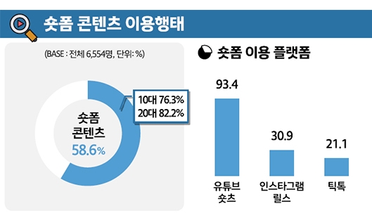 1분 내외 짧은 길이의 동영상인 ‘숏폼’ 이용률의 증가도 유튜브 이용을 늘리는 요인이 된다. 이번 조사에서 ‘숏폼’ 콘텐츠 이용률은 58.6%였다. 시청 이유는 ▲짧아서 부담이 없어서(76.0%) ▲재미있는 부분만 보려고(51.4%) ▲추천 알고리즘 때문(47.0%) 순으로 나타났다.