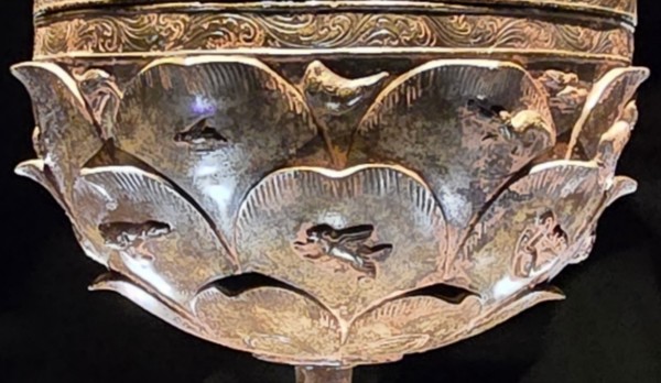 몸체 연꽃 잎에는 춤추는 학, 날개 달린 자라, 물고기를 삼키고 있는 수달, 머리에 깃털이 있고 발은 넷이며 몸은 도롱뇽의 형태를 한 청어, 날개 달린 잉어 등 27마리의 동물과 2명의 사람이 돋을새김 되어 있다.