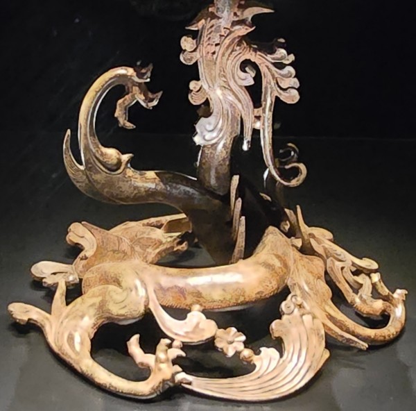 대향로의 받침대는 수중생물의 왕 용이 향로의 몸체를 입으로 받치고 세 다리를 땅에 딛고 한 다리는 들고 용트림을 하듯이 원형을 이루고 있는데, 땅을 딛는 다리는 정 삼각형을 이루고 있어 향로 전체의 균형을 이루고 있다.