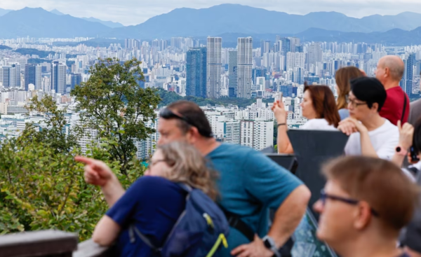 서울 남산에서 외국인 관광객들이 도심 전경을 감상하고 있다.