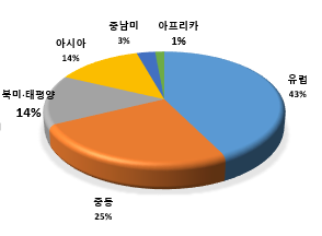 유럽 42.6%, 중동 25.1%, 북미 태평양 14.3% 순