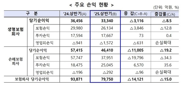금융감독원 '25년 상반기 보험회사 경영실적 발표