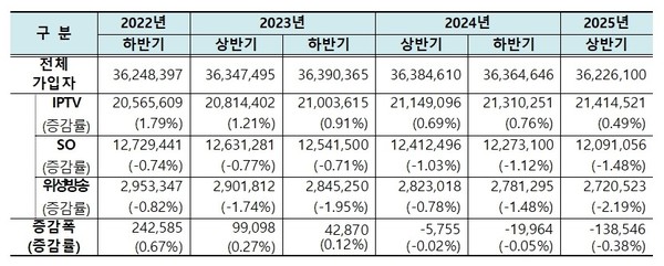올해 상반기 기준 유료방송 가입자 수는 3622만 6100 단자로, 지난해 상반기 기준 가입자 수 최초 감소를 기록한 이래 감소 추이가 지속되고 있는 것으로 나타...