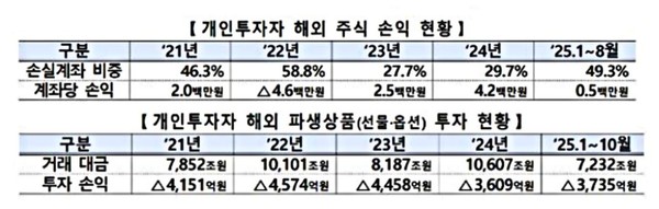 해외 파생상품의 경우 개인 투자자는 시장 상황과 무관하게 수년간 대규모 손실을 지속 중이다. 올해 들어 10월까지 거래대금은 7232조원이었는데, 투자손익은 3735억원 마이너스였다.