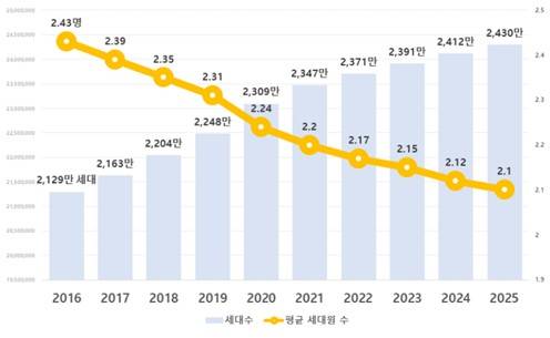 2025년 주민등록 세대 수는 2430만87세대로 전년보다 18만1159세대(0.75%) 증가했지만, 평균 세대원 수는 2.10명으로 0.02명 감소했다.