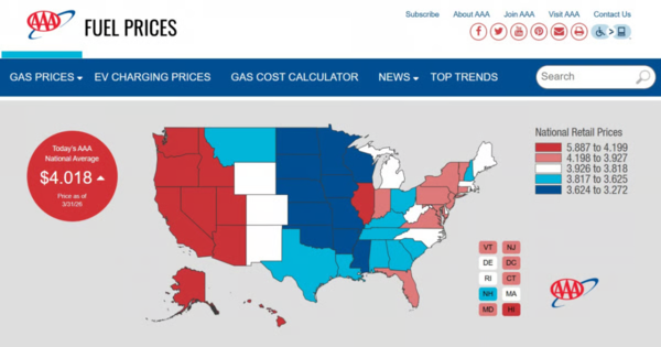 미국자동차협회(AAA)에 따르면 31일(현지시간) 미국 전국 평균 휘발유 가격은 갤런당 4.018달러로 집계됐다. 이는 우크라이나 전쟁으로 에너지 시장이 크게 흔들렸던 2022년 8월 이후 가장 높은 수준이다.