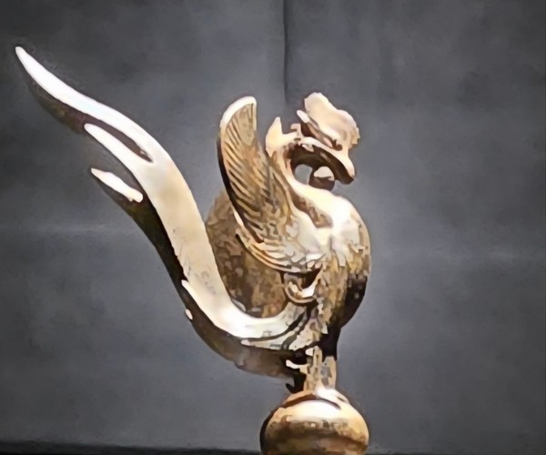 꼭지에는 수탉 볏을 한 봉황이 날개를 활짝 펴고 긴 꼬리를 드높게 날리며 턱 아래 작은 구슬을 괸 채 세상을 굽어보고 있다.