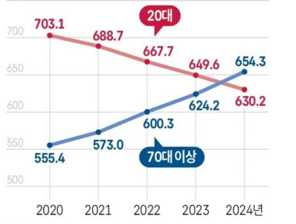 장기간 지속된 저출산 고령화 여파로 20대 인구가 빠르게 줄면서 70대 이상 노령층에도 추월당했다. 20대는 한때 성인 연령대 중 인구가 가장 많았으나, 이제는 가장 소수 세대로 쪼그라들었다.